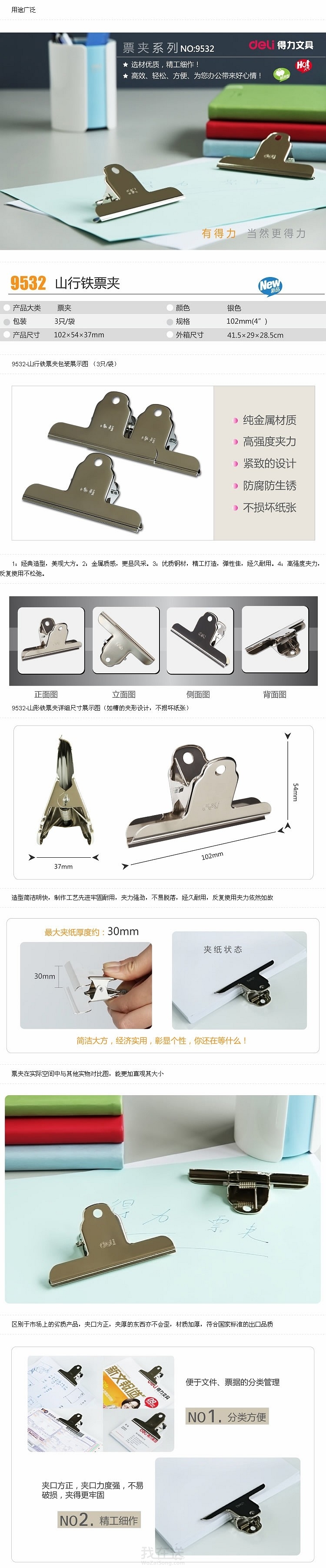 得力9532-2﹟山形铁票夹铁夹102mm袋装(3只/包)