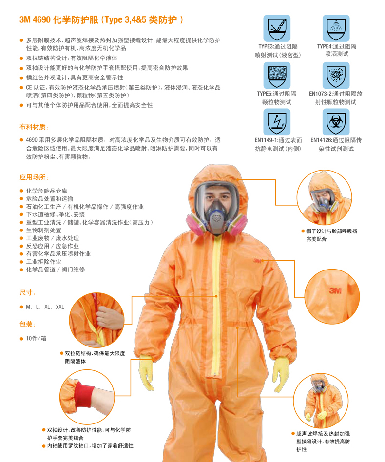 • 商品名称:3M 4690 橙色带帽连体防护服
